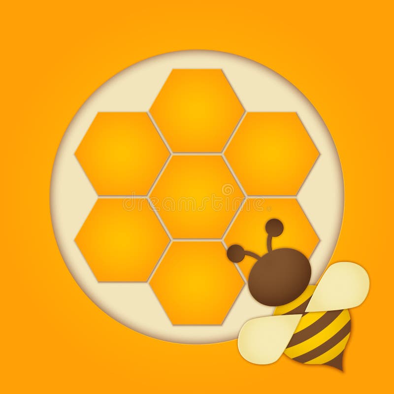 Honey label premium quality title. Paper cut style bee with honeycombs and Bee. Template design for beekeeping and honey product. Grey and orange background, vector illustration.