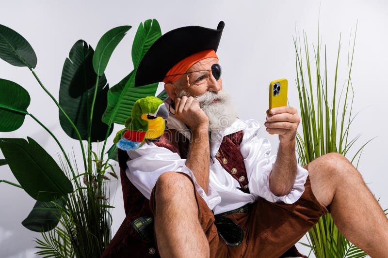 Bearded old pirate with parrot using smartphone in tropical setting. Elderly pirate with eye patch and parrot on shoulder checks smartphone while sitting among lush tropical plants.