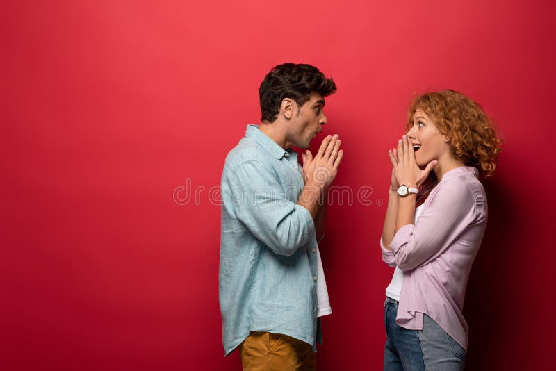 Beautiful shocked couple looking at each other, isolated on red