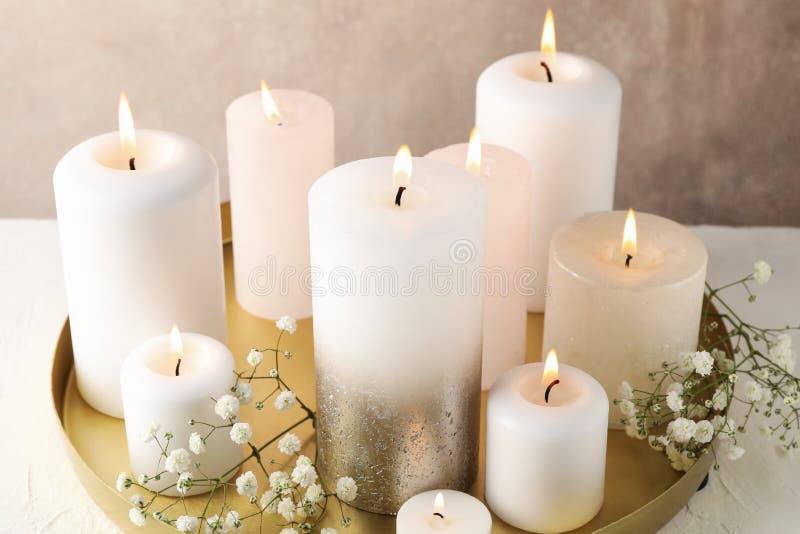 Burning candles, tray and flower on white table, close up