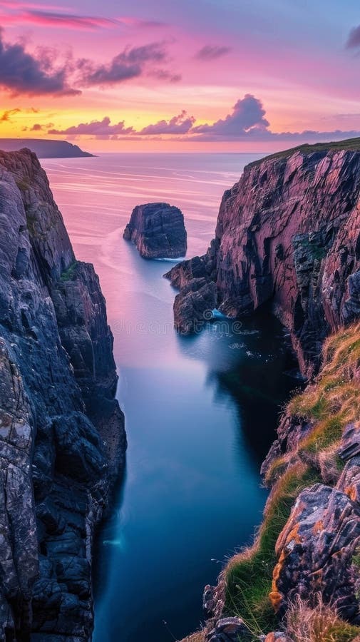 A cliffside view overlooking a vast ocean under a pink sunset sky stock photo A cliffside view overlooking a vast ocean under a pink sunset sky