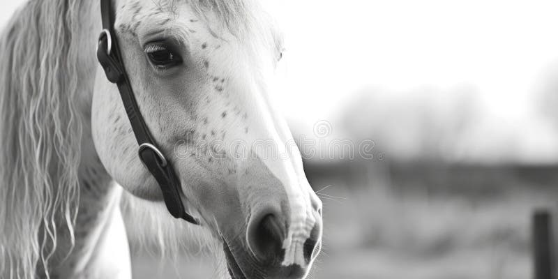 A black and white photo of a horse with a white face and a black bridle stock photo A black and white photo of a horse with a white face and a black bridle