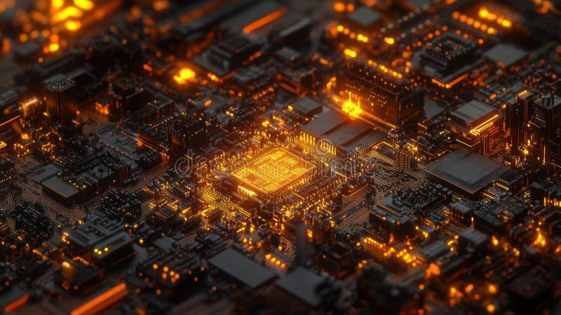 Cpu processing data on motherboard with orange lights. Complex electronic circuit board featuring glowing orange lights, illustrating data processing and showcasing advanced technology in a detailed and captivating manner AI generated