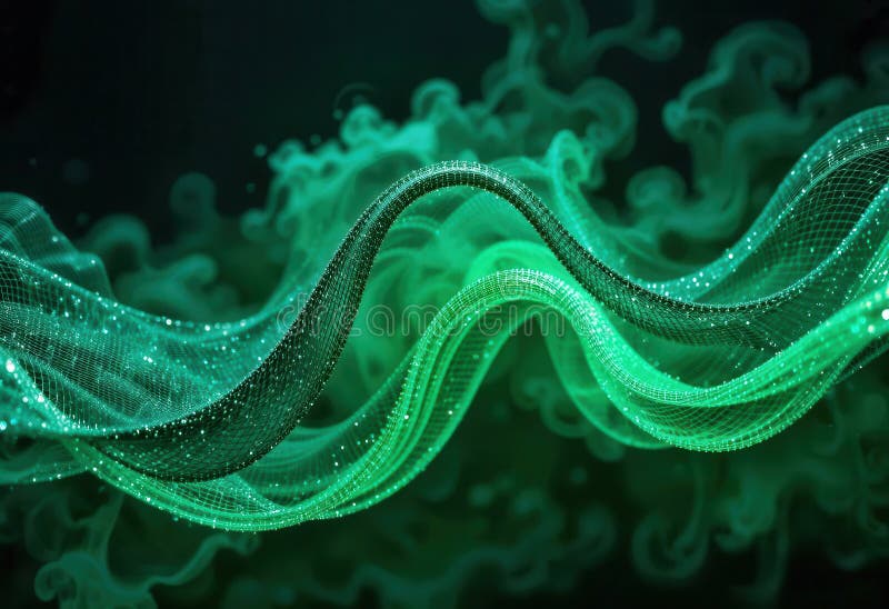 Dynamic green wave pattern creating a vibrant background for computer monitors and digital displays. Glowing green wave design creates an eye-catching backdrop for digital screens, boosting visibility. AI generated