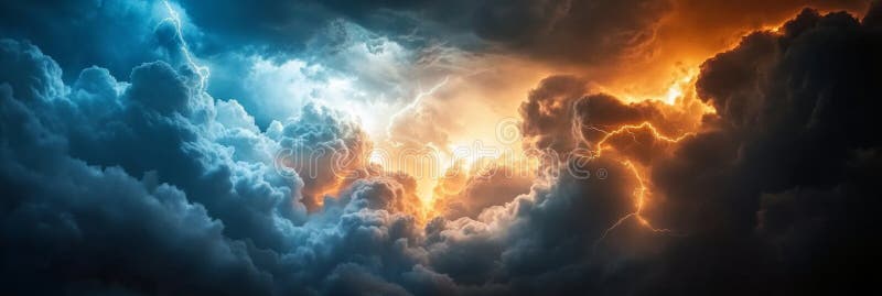 Epic Dramatic Stormy Sky With Dark Clouds, Lightning Strikes and Sunlight, Natural Background, Generated by AI