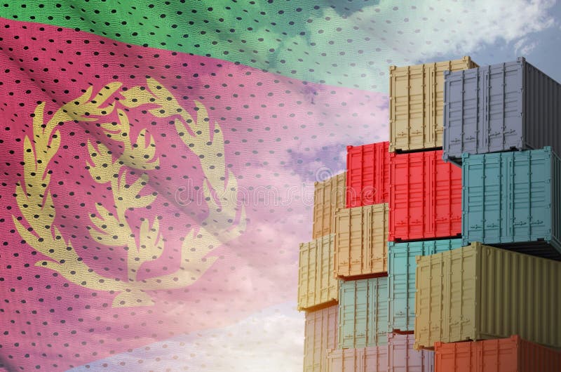 Eritrea flag and big stack of shipping cargo containers in docks with sky background close up