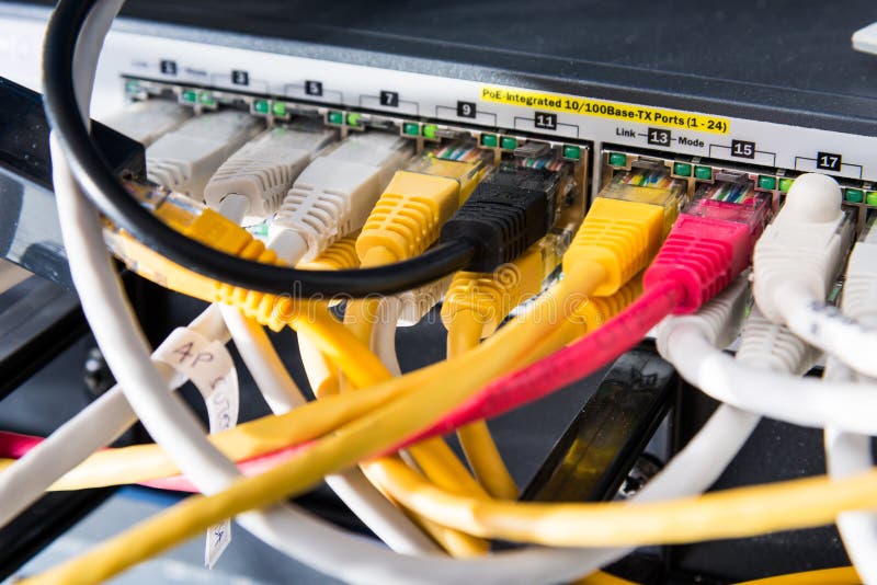 Ethernet cables connected to server switch. backside of server rack with patch cable connected into the switch panel