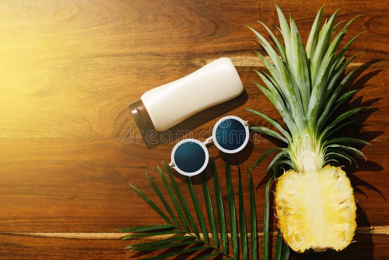 Flat lay of Sunscreen, sunglasses and pineapple fruit. Different items for beach vacations. Sunscreen, sunglasses and pineapple fruit
