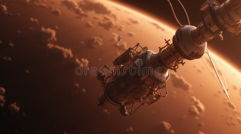 Futuristic Space Station Orbiting Mars. This stunning image captures a futuristic space station orbiting the red planet, showcasing advanced technology and cosmic beauty