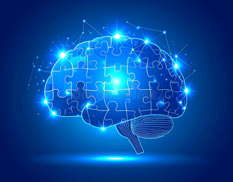 Glowing Brain Puzzle — Problem Solving and Intelligence Concept, AI-Generated. Futuristic digital illustration of a glowing human brain formed from connected puzzle pieces, symbolizing problem-solving, critical thinking, innovation, and artificial intelligence. The concept visualizes the process of finding solutions, learning, and connecting ideas through technology, data, and human cognition in a luminous blue networked design.