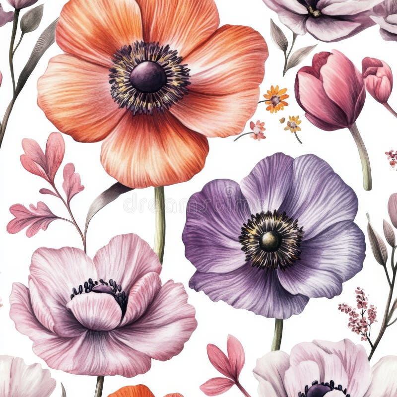 Hand-painted, seamless pattern featuring multicolored spring flowers in watercolor. AI generated