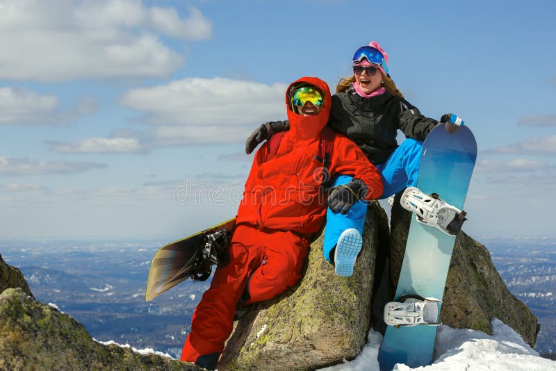 Happy snowboarding couple in winter mountains. Couple of happy snowboarders posing on mountain top against blue sky