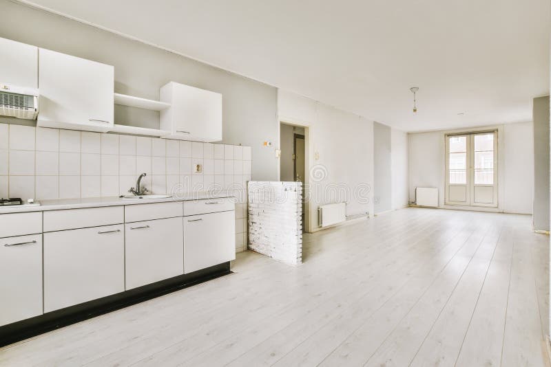 Spacious bright white kitchen with windows. Interior of empty white kitchen with windows and wooden parquet floor