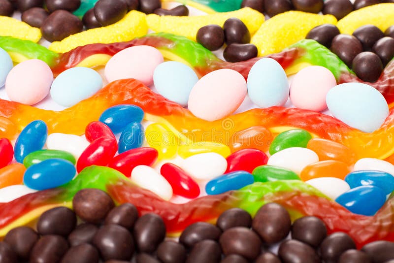 Macro colorful candy, lollipop and sweets background. Top view. Selective focus.