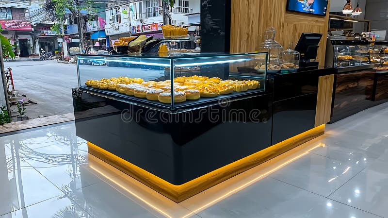 Modern Bakery Display Case with Delicious Pastries. A modern bakery display case featuring a tempting array of filled pastries. The sleek design showcases delicious treats, creating an inviting atmosphere for customers, Generative AI
