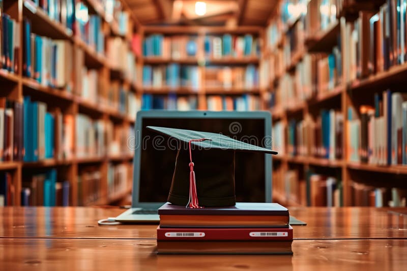 Modern laptop computer and pile of books with graduation cap icon in library. A modern laptop computer placed next to a stack of colorful books with a graduation cap icon in a warm, cozy library setting, depicting education and learning. AI generated