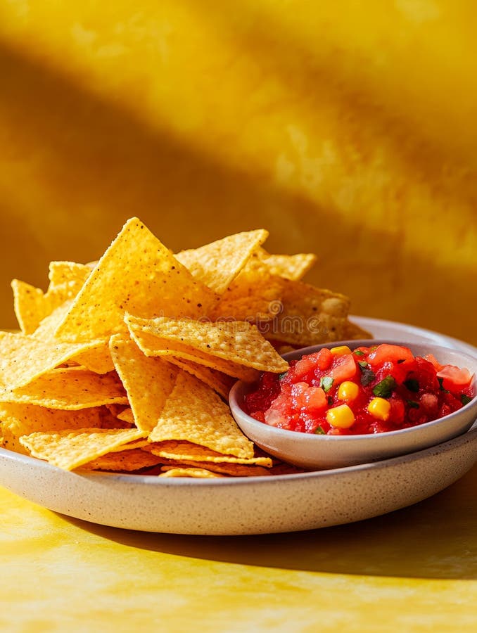 Nachos with salsa on a yellow background. Versatile image for multiple purposes
