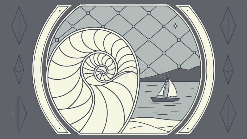 Nautilus Shell in Framed Nautical Compass, vector design Generative AI. An intricate vector illustration featuring a nautilus shell centered within a detailed nautical compass design, with a sailboat in the background. The artwork combines natural beauty with maritime symbolism, evoking themes of journey, direction, and exploration. Ideal for nautical decor or travel themes, vector design Generative AI