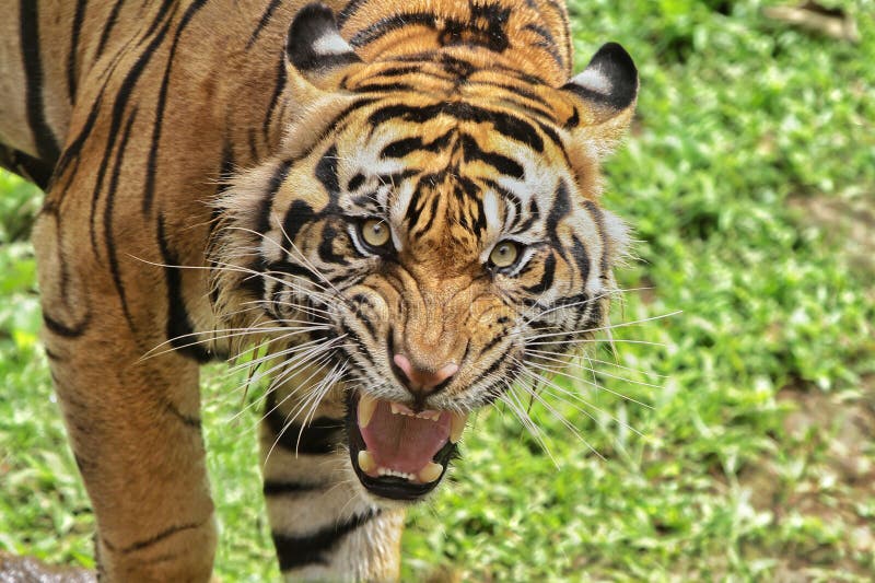 Roaring. Portrait of an angry Sumatran tiger