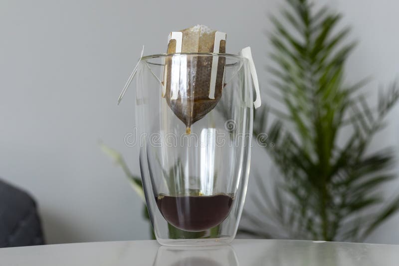 The process of brewing a morning coffee drip with a filter bag in a double-bottomed clear cup.