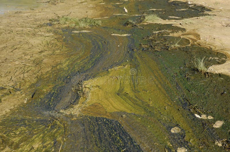 River algae art. An abstract drawing made by the river with algae and silt during a gradual fall of the water level in the presence of drought