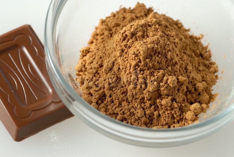 Guarana powder and a piece chocolate. Macro of guarana powder in a glass cup ans a piece chocolate with guarana as ingredient