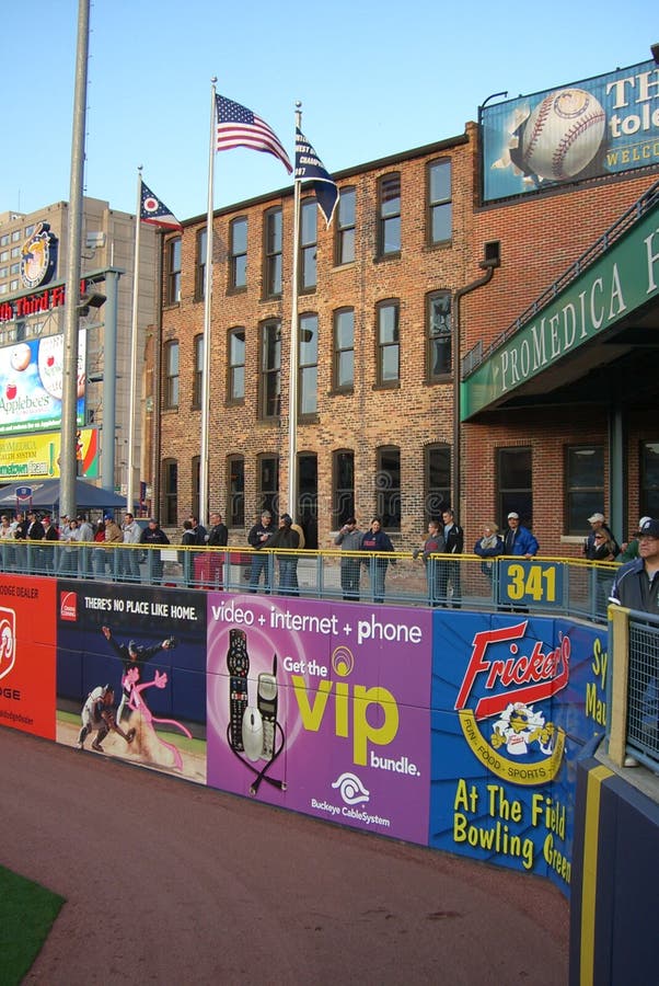 Toledo Mud Hens Baseball Fans. Mud Hens fans watch an early spring game with colorful billboards and old building background