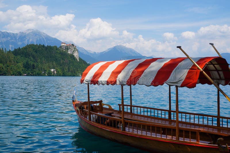 Row boat on a lake. Row boat on Bled Lake, with Bled Castle in the background, Slovenia