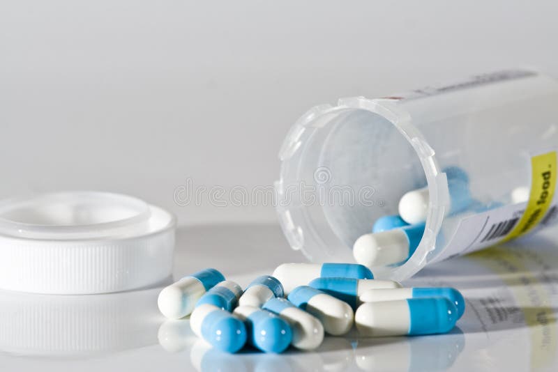 Blue and white pills. Blue and white medication (pills) spilled out of a pill bottle onto a white background