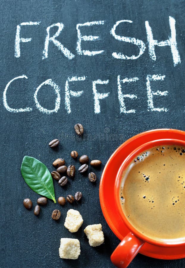 Fresh coffee. Cup of coffee with written text