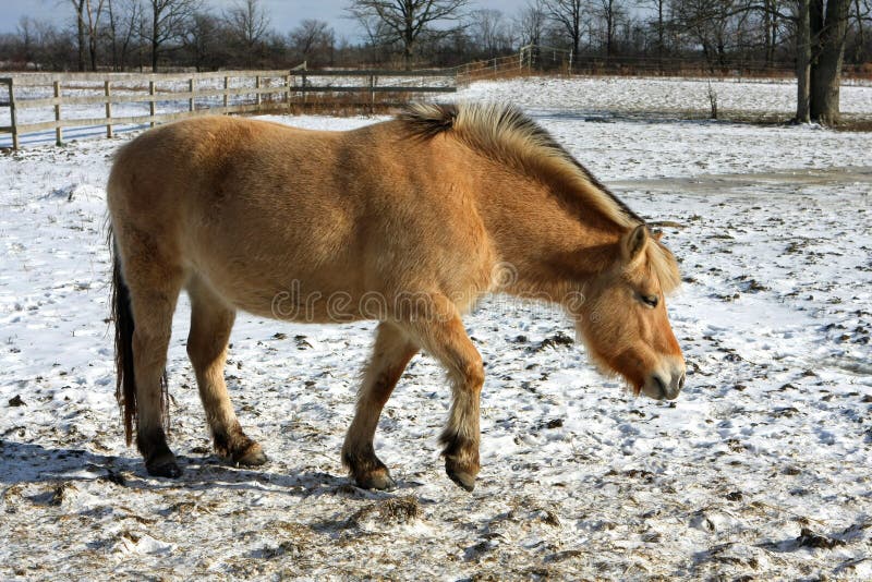 Norwegian fjord horse walking in pasture in snow