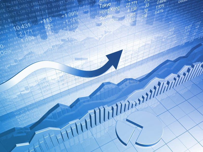 Stock Market Graph with Pie Chart and Up Arrow. Financial bar graph with market indicators