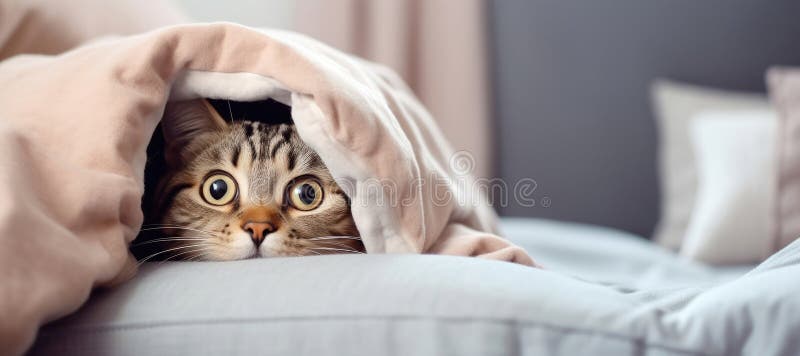 Scared Cat in a Bed, Generative AI. Scared cat under the blanket in a bed, Generative AI