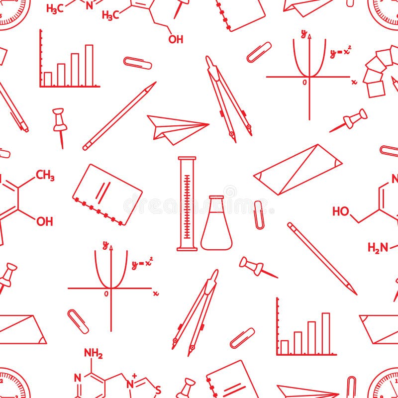 Scientific, educational vector seamless pattern. seamless pattern with scientific, education elements: flasks and molecule structure and function graph and pencil and pen andVector. clip, compasses. Design for websites, poster, apps, print