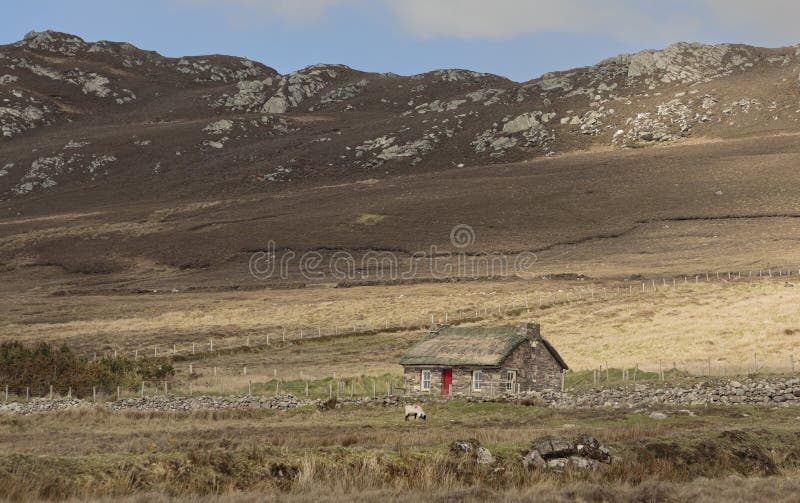 Small cottage made of stone with a roof made of grass. Small cottage made of stone with a grass roof on a stark hillside