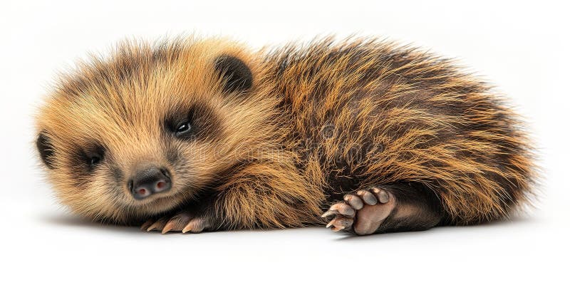 Soft hedgehog curled up in a cozy position on a light background during daytime. A small hedgehog is curled up in a relaxed pose, showcasing its soft fur and tiny paws. The setting is AI generated