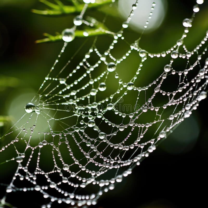 A spider web with water droplets on it, AI. A spider web with water droplets on it AI generated