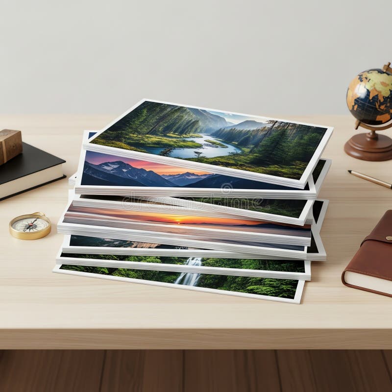 Stack of Landscape Photos on Desk with Globe and Compass. A stack of landscape photographs on a wooden desk, with a globe, compass, and journal