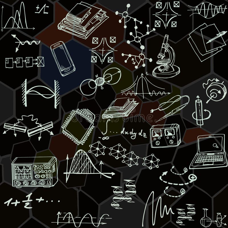 Nanoscience and physics seamless pattern with sketch elements. Science background with decorative formulas and graphs. Hand drawn.