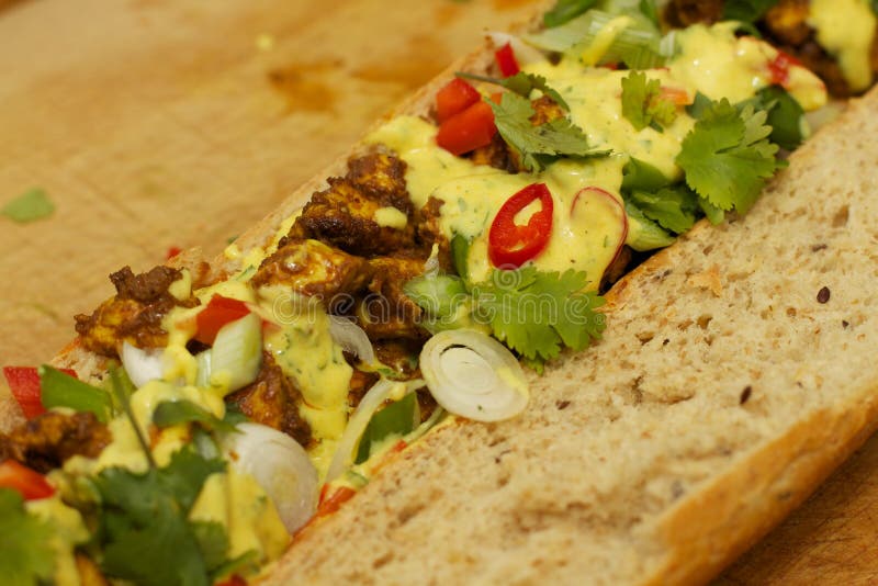 Baguette with fried chicken and curry sauce and some coriander and red pepper.