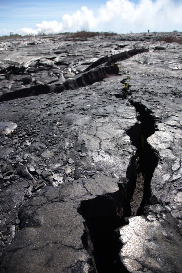 A close-up view of a cracked hardened lava surface at Kilauea Volcano, Hawaii. The dark volcanic rock glistens under the sunlight, showing deep fissures and rugged texture formed by past eruptions. A powerful reminder of nature's raw energy and geological transformation.