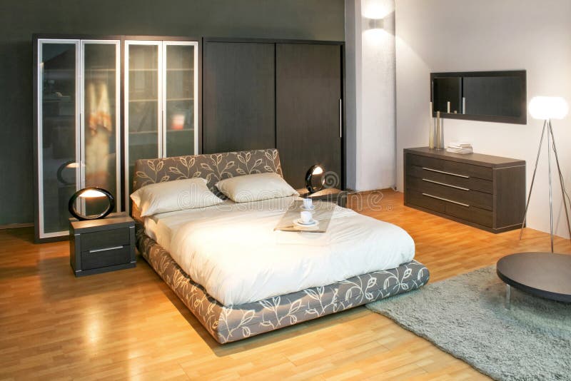 Modern bedroom angle. Modern double bed and big wardrobe closet