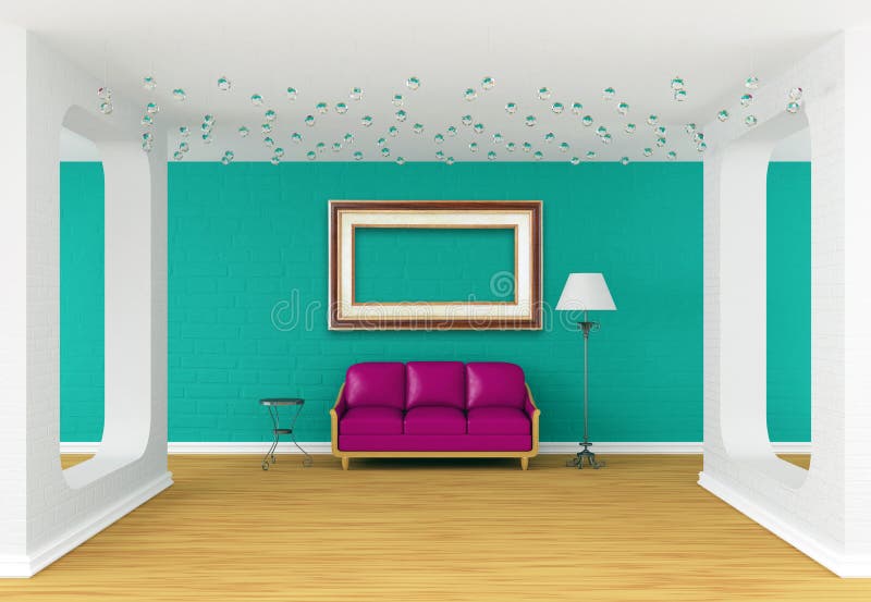 Purple couch, table and standard lamp and picture frame in modern gallery s hall