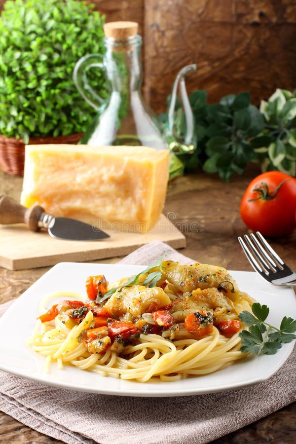 Pasta with fresh grouper fillet on complex background