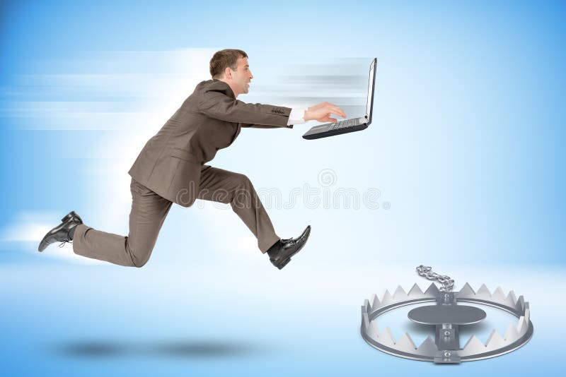 Businessman running forward. Businessman with laptop running forward to beartrap