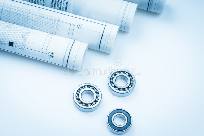 Construction drawings slide caliper roller bearings on blueprint architecture and building concept. Drawing and drawing tools on the industrial designer s desk