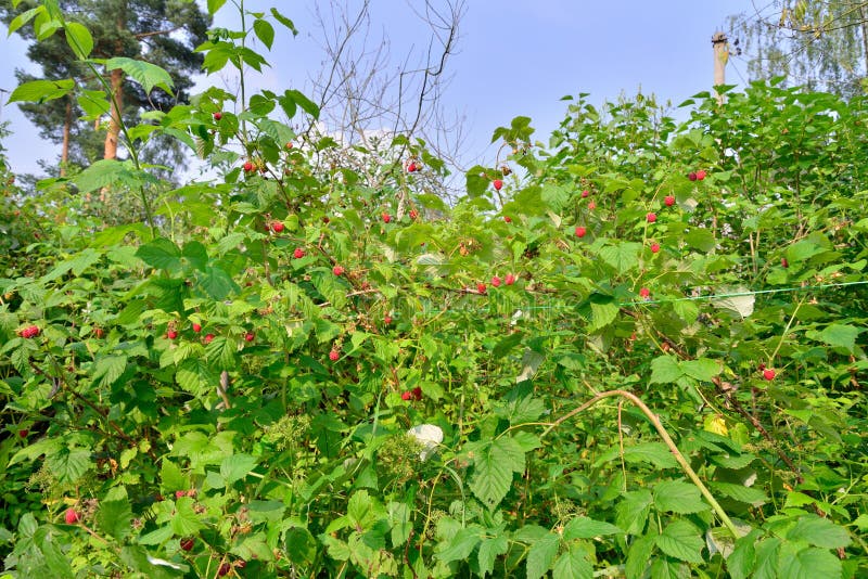 Dense thickets of raspberry bushes Laden with ripe berries in the suburbs of St. Petersburg