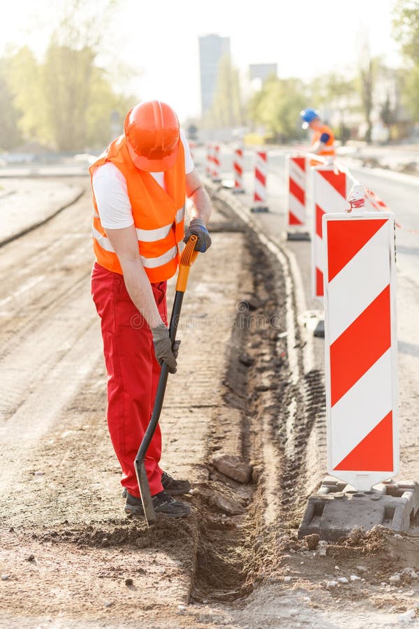 Hard working builder digging the ditch on construction site