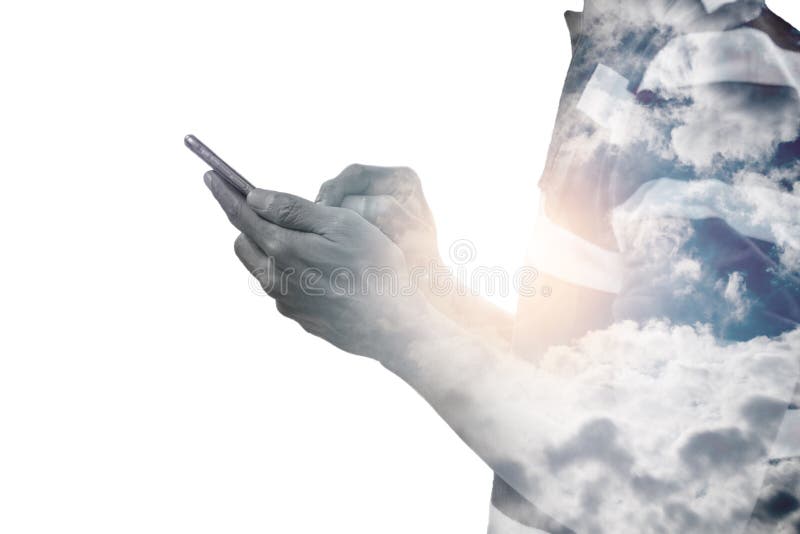 Double exposure man using smartphone and summer sky. Double exposure man using smartphone and shiny cloudy sky - represent modern world communication between people and cloud storage