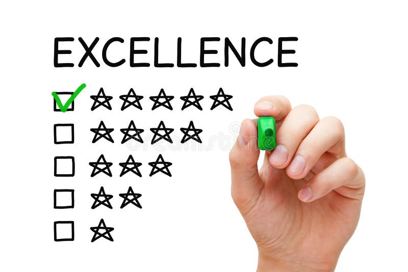 Excellence Rating Concept. Hand putting check mark with green marker on Excellence five star rating.